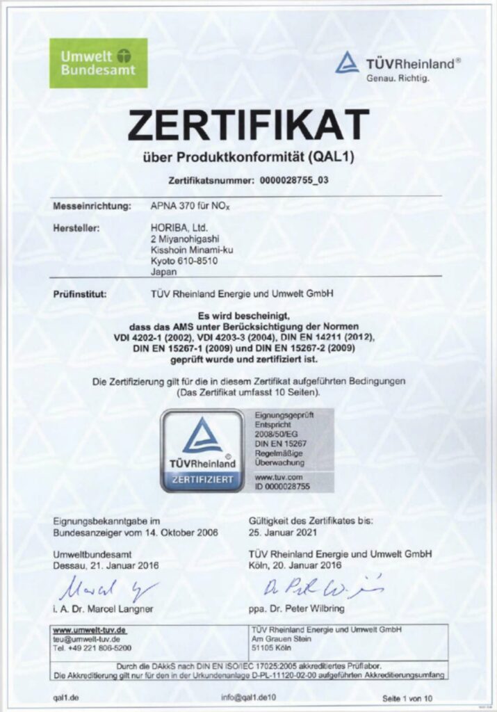 TÜV Rheinland und UBA bescheinigen dem Horiba APNA 370 seit Jahren wiederholt per Zertifikat die Übereinstimmung mit der EN 14211:2012 (s. Abb. 1).